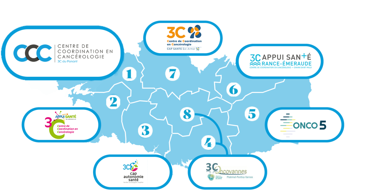 En Bretagne, Il existe 7 « 3C » fédérés par un Réseau Régional de Cancérologie (RRC) : ONCOBRETAGNE.